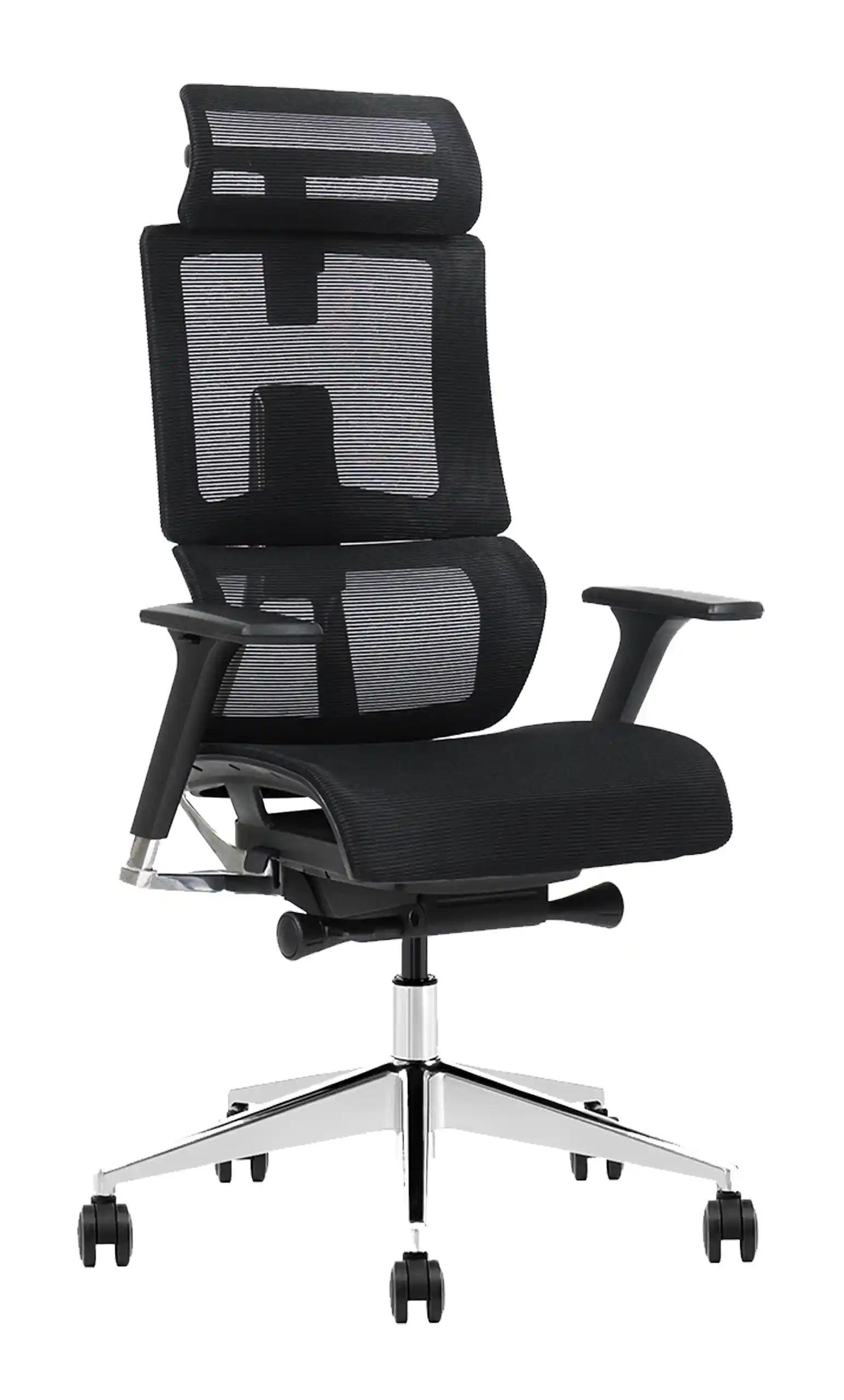 Respaldo y asiento en mesh totalmente en color negro. Respaldo graduable en altura con marco metálico en estructura. Base cromada con 5 rodos. Apoya brazos ajustables. Soporte lumbar. Apoya cabezas ajustable en altura.